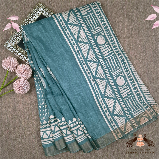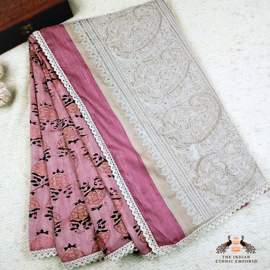 Bhagalpuri Silk Saree With Lucknowi Hand Chikankari & Hand Block Print
