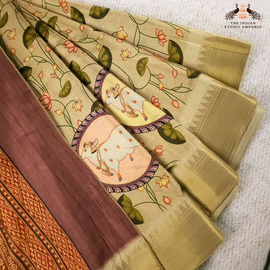 Beige color Tussar Silk Pichwai Saree from Pichwai Palette Collection - SAADGI