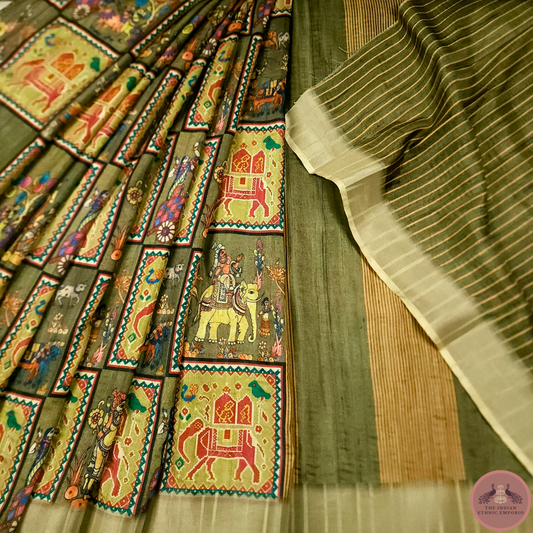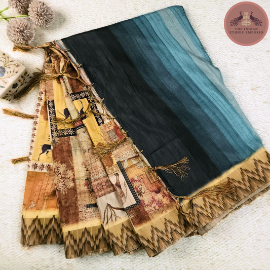 The true charm of the "Gicha Glory" collection lies in its detailed prints, which narrate stories with its exquisite motifs. You’ll find intricate human figurines and divine depictions of Radha and Krishna, adding a spiritual and cultural depth to your attire. These sarees are not merely garments but canvases that portray the divine love of Radha Krishna, bringing a touch of sacredness to your wardrobe. The Mughal-inspired designs showcase regal elegance with rich animal prints and opulent patterns reminiscent of royal tapestries, offering a vintage appeal that resonates with history and grandeur.