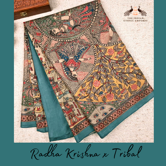 Radha Krishna X Tribal - Madhubani Print Tussar Silk Saree from THE SAREE STORY