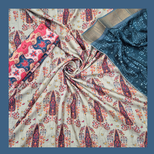 Satrangi Atrangi - Grey color Mughal inspired Tree of Life Print Premium Gicha Silk Saree for Women