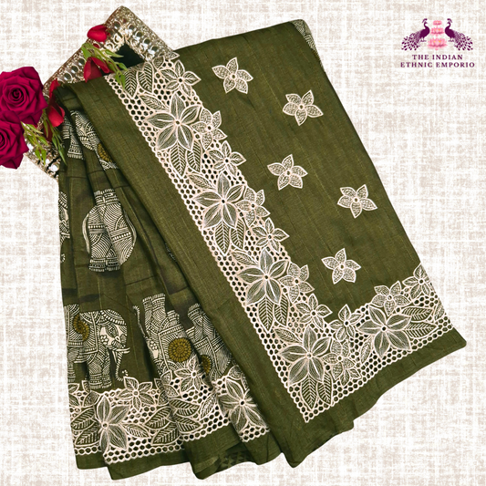 Tussar Silk Sarees with Elehphant Motif Print & Cut Work Border